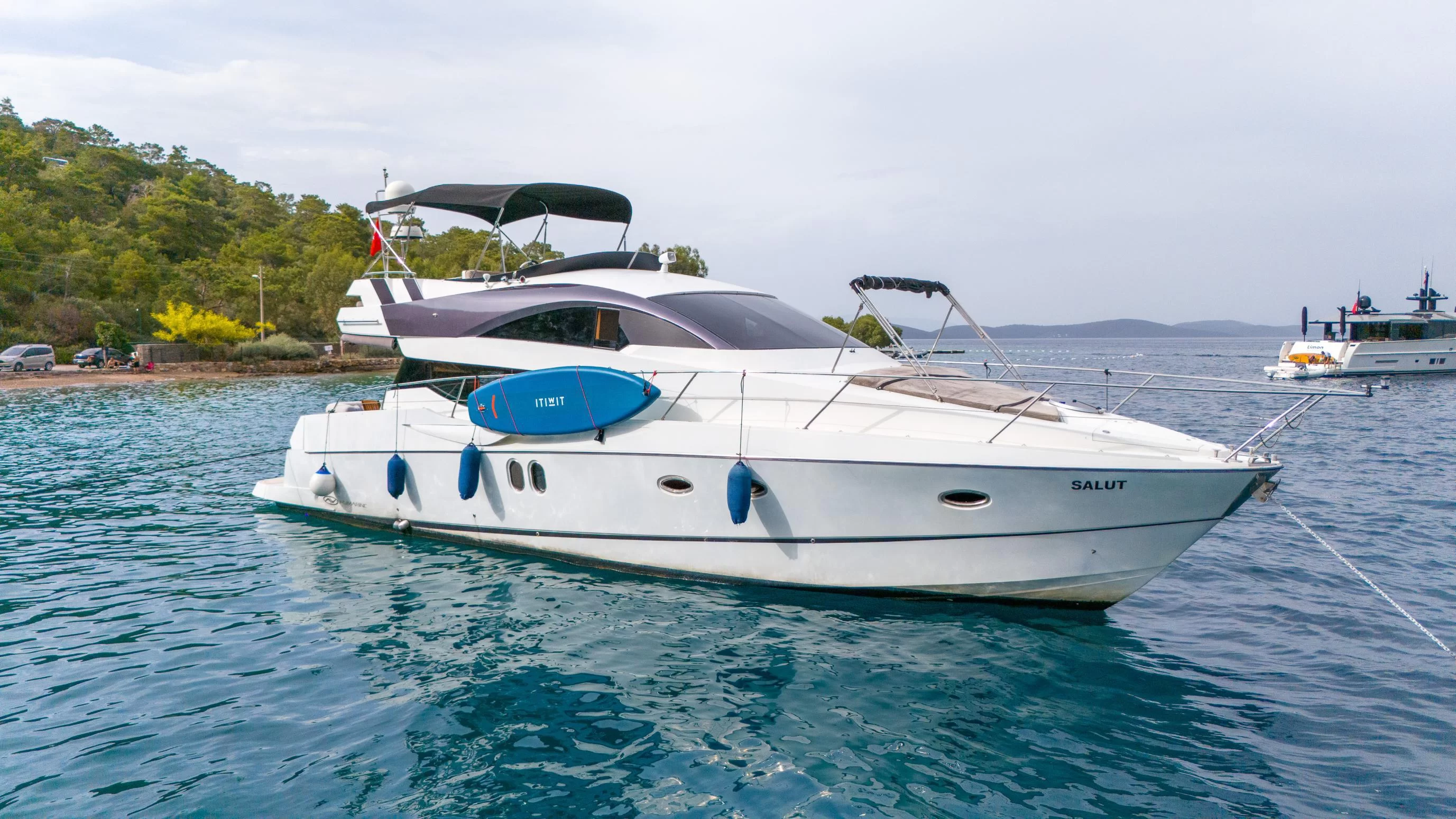 The 18-meter motor yacht Salut, a perfect choice for a luxurious experience in the blue waters of Bodrum, offers sea lovers an unforgettable blue voyage. Standing out with its modern design and fully equipped features, Salut provides comfortable and cozy accommodation for up to 6 people with its 3 spacious cabins. Offering its guests a peaceful atmosphere with its elegant interiors, spacious seating areas and stylish deck, this motor yacht is an ideal option for exploring the unique bays of Bodrum. With its spacious sunbathing areas, special corners for delicious meals and easy access to the sea, you can fill every moment with pleasure.